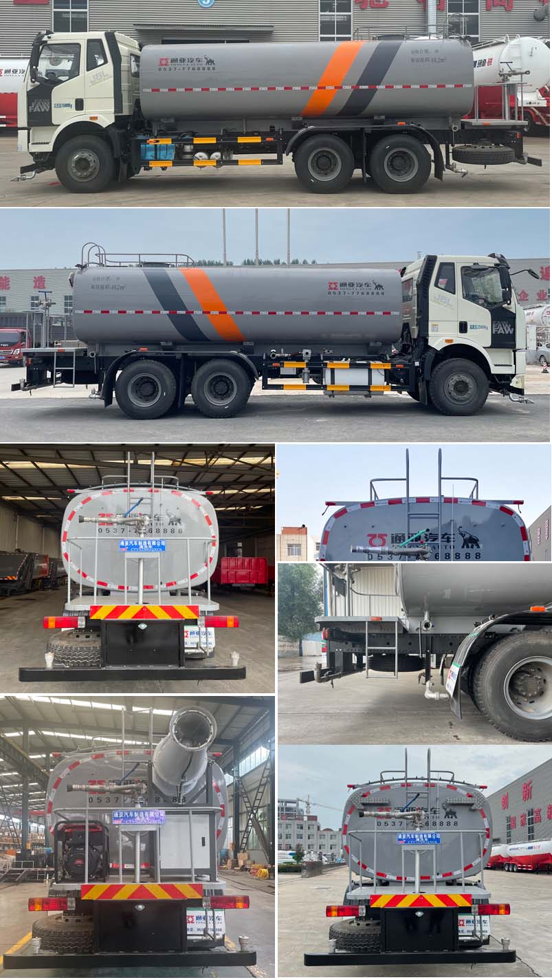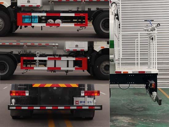 其它 罐體及清洗裝置,用于清理路面或管道沉積物或清洗機(jī)械表面;僅采用軸距為:4350+1350mm,選裝前高壓沖洗裝置時,前伸為920mm,整備質(zhì)量為:11370kg,罐體有效容積為13.4立方米,罐體尺寸(長×長軸×短軸)(mm):5800×2290×1590;整備質(zhì)量為:10585kg時,罐體有效容積為14.2立方米,罐體尺寸(長×長軸×短軸)(mm):6000×2290×1550;選裝后部加裝圓形指示燈或箭頭指示燈,選裝兩種指示燈安裝一種或兩種同時安裝,選裝加裝后上部噴霧桿,選裝后部加裝噴霧機(jī)裝置,側(cè)后防護(hù)裝置材料均為:Q235B,側(cè)防護(hù)裝置與車架連接方式為螺栓連接;后防護(hù)裝置與車架連接方式為焊接,后防護(hù)裝置截面尺寸為:120×68mm,離地高度480mm;ABS生產(chǎn)廠家:1.長春瑞立科密汽車電子有限公司,型號:CM4XL.ABS生產(chǎn)廠家:2.威伯科汽車控制系統(tǒng)(中國)有限公司,型號:ABS-E.裝備限速裝置,限速89km/h.