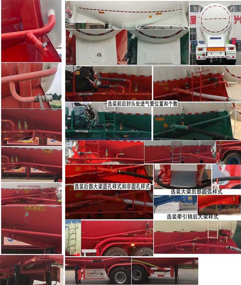 罐體總?cè)萘?29.2立方米,罐體有效容積:27.8立方米,運(yùn)輸介質(zhì):固井專用水泥,介質(zhì)密度:1200千克/立方米;罐體外形尺寸罐體長(zhǎng)(含封頭)8540mm,最大截面處寬2550mm,最大截面處高3040mm,最小封頭直徑為2010mm(選裝最小封頭直徑為1910mm),選裝罐體長(zhǎng)(含封頭)為8050mm,最大截面處寬2550mm,最大截面處高3040mm,最小封頭直徑為2010mm(選裝最小封頭直徑為1910mm);選裝前部不加裝機(jī)組時(shí)整車長(zhǎng)度(mm)為:8720,8300,選裝走臺(tái)樣式,選裝后組合燈樣式,選裝后組合燈所在部件樣式,選裝尾部標(biāo)志板安裝位置,選裝號(hào)牌板安裝位置,選裝前位燈前回復(fù)反射器安裝位置及所在部件樣式,選裝前位燈樣式,選裝爬梯安裝位置(前部/側(cè)面/后部)和個(gè)數(shù)(一個(gè)/兩個(gè)/三個(gè)),選裝前后封頭處進(jìn)氣管位置和個(gè)數(shù),選裝大梁圓孔樣式和非圓孔樣式,選裝大梁后部圓弧樣式,選裝牽引銷后大梁樣式,選裝空氣懸架,選裝后部大梁堵板樣式,選裝下出灰管道樣式,選裝管道樣式,選裝機(jī)組樣式,選裝外觀樣式;ABS系統(tǒng)生產(chǎn)廠家:廣州瑞立科密汽車電子股份有限公司,梁山順安達(dá)汽車科技有限公司,廣州市西合汽車電子裝備有限公司,山東梁山德爾福汽車科技有限公司,型號(hào):CM2XL-4S/2M,SAD-ABS4S/2M,XH-GQ4S2M-E01,DEF-ABS4S/3M;側(cè)面及后下部防護(hù)裝置所用材料材質(zhì)為:鋁合金,側(cè)面及后下部防護(hù)裝置與車輛連接方式均為:螺栓連接,后部防護(hù)裝置的主要尺寸參數(shù):斷面尺寸(mm)為120×68,離地高度為:500mm,選裝側(cè)面及后下部防護(hù)裝置所用材料材質(zhì)為:Q235,與車架連接方式均為焊接或螺栓連接; 頂部封閉不可開槽,后部不可開啟;車長(zhǎng)/牽引銷到車輛最前端距離/軸距/后懸對(duì)應(yīng)關(guān)系為:9500/1230/4800+1310+1310/850,9500/1470/4560+1310+1310/850,9500/1470/4370+1310+1310/1040,8720/450/4800+1310+1310/850,8720/960/4370+1310+1310/770,8300/540/4370+1310+1310/770,8720/690/4560+1310+1310/850,8720/770/4560+1310+1310/770,8720/530/4800+1310+1310/770. |