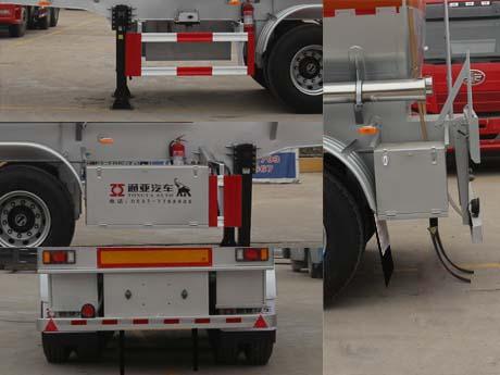 采用適用于牽引危險(xiǎn)品運(yùn)輸半掛車的牽引車.類項(xiàng)號(hào):8,運(yùn)送危險(xiǎn)貨物車輛的類型:AT;罐體總?cè)莘e:28立方米,罐體外形尺寸為:長9400mm,最大直徑2050mm;ABS系統(tǒng)生產(chǎn)廠家:廣州瑞立科密汽車電子股份有限公司,梁山順安達(dá)汽車科技有限公司,ABS型號(hào):CM2XL-4S/2M,SAD-ABS4S/2M;側(cè)面及后下部防護(hù)裝置所有材料材質(zhì):Q235,側(cè)后防護(hù)連接方式均為:焊接或螺栓連接,后部防護(hù)裝置的主要尺寸參數(shù):斷面尺寸(mm):120×68,離地高度:500mm.
