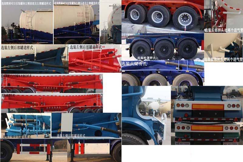 | 其它 | 罐體總?cè)萘繛?57立方米,罐體有效容積:54.8立方米;運輸介質(zhì):煙煤粉,罐體尺寸(含封頭)長:11330mm,寬:2540mm,最大截面高度:3350mm(選裝罐體最大截面高度為:3450mm),前后封頭直徑:2010mm(選裝前后封頭直徑為:2110mm),選裝車輛前部不加裝機組,ABS系統(tǒng)生產(chǎn)廠家:廣州瑞立科密汽車電子股份有限公司,梁山順安達汽車科技有限公司,山東梁山德爾福汽車科技有限公司,型號:CM2XL-4S/2K(4S/2M),SAD-ABS4S/2M,DEF-ABS4S/3M;側(cè)面及后下部防護裝置所用材料材質(zhì)為:Q235,側(cè)面及后下部防護裝置與車輛連接方式均為:螺栓連接或焊接,后部防護裝置的主要尺寸參數(shù):斷面尺寸(mm)為120×68,離地高度為:500mm.頂部封閉不可開槽,后部不可開啟.選裝燈具型號及后組合燈所在部件樣式.選裝大梁后部可以為弧形,選裝爬梯的安裝位置可以在罐體左側(cè)前部或后部或罐體后部,爬梯個數(shù)可以為一個或兩個或三個,選裝輪罩樣式及鋁合金輪轂,選裝走臺樣式,選裝罐頂升降護欄,頂部可為擋水槽式也可為走臺式,選裝前后封頭處進氣管位置和個數(shù),工具箱位置可選裝,選裝罐蓋個數(shù)及位置,選裝罐體管道的樣式,選裝大梁可以為鉆孔樣式,選裝牽引銷后大梁樣式,選裝下出料樣式,選裝爬梯安裝位置(前部/側(cè)面/后部),選裝后尾小工具箱樣式,選裝側(cè)面管道樣式,選裝機組樣式,選裝雙助吹樣式,選裝支腿連接件樣式,選裝外接氣源樣式,選裝壓力表安裝位置,選裝尾部標(biāo)志板安裝位置,選裝號牌板安裝位置,選裝雙邊支梁樣式,選裝機組樣式. | ||