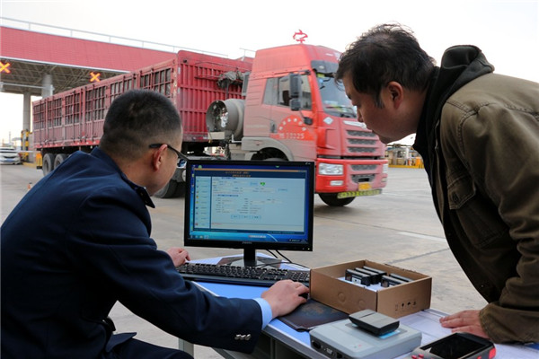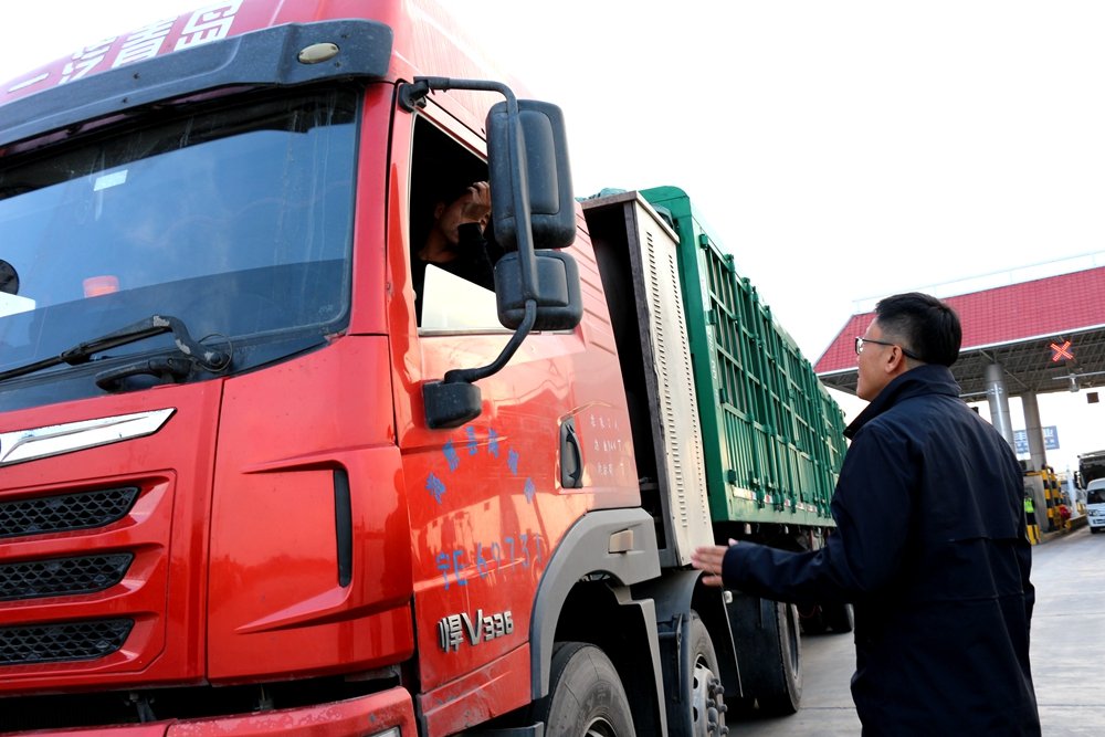 ETC發(fā)行工作人員向貨車司機(jī)宣傳辦理記賬式貨車ETC的好處。
