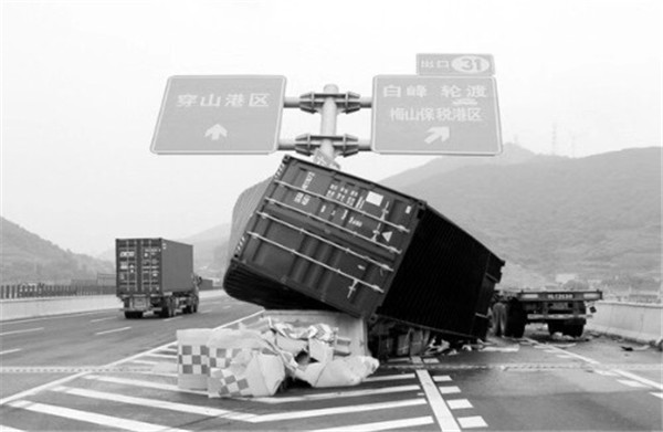2、2016年7月15日,上海一輛往市區(qū)方向行駛的集卡沖過中央護欄撞向往金山衛(wèi)方向行駛的一輛轎車,因為用于固定集裝箱和卡車的鎖扣沒有鎖上,集裝箱體掉落在S4市區(qū)方向主線上,造成雙向擁堵長達兩公里。