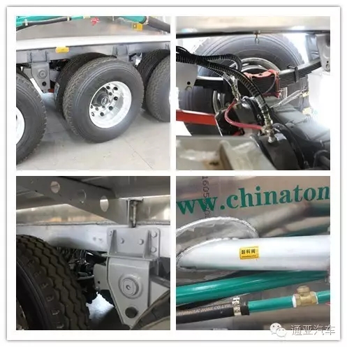這臺(tái)車采用5454型鋁合金材質(zhì),9.0-22.5鋁合金真空鋼圈。廣東富華高端VALX 10T車軸(含科密ABS)。罐蓋、透氣帶墊板、支腿、工具箱、側(cè)后防護(hù)等全部采用鋁合金。
