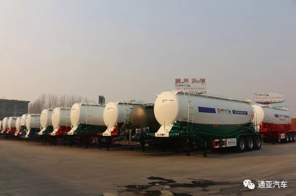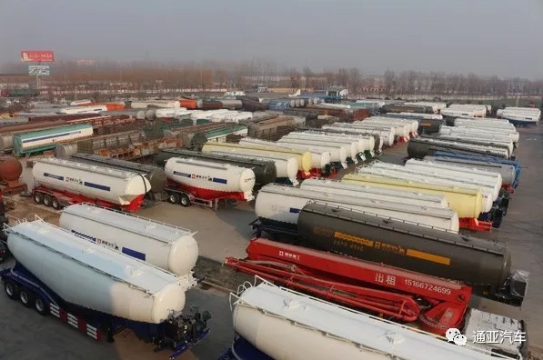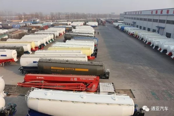 成品庫(kù)一排排的粉罐車(chē)等待客戶前來(lái)提車(chē)。